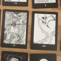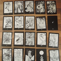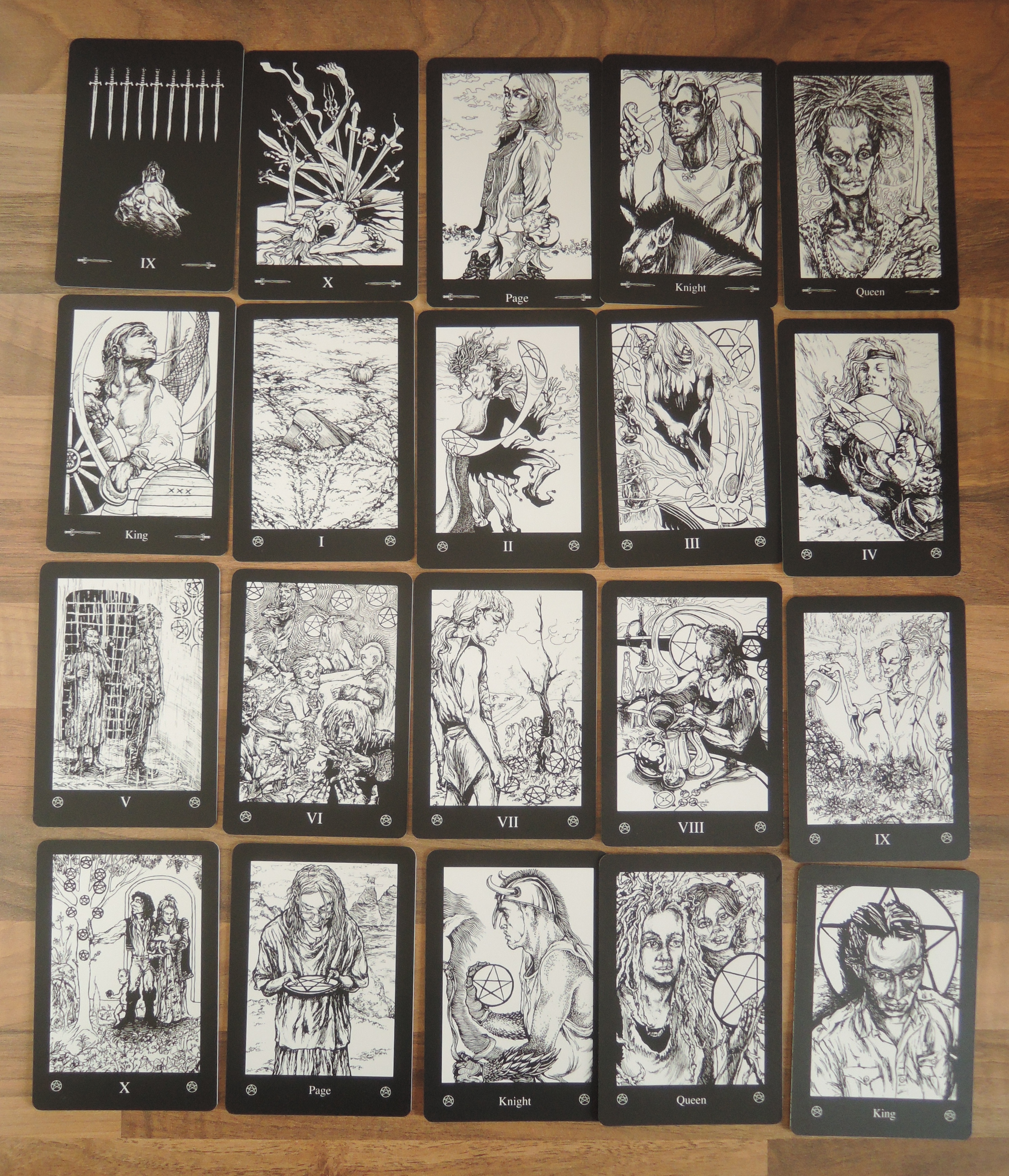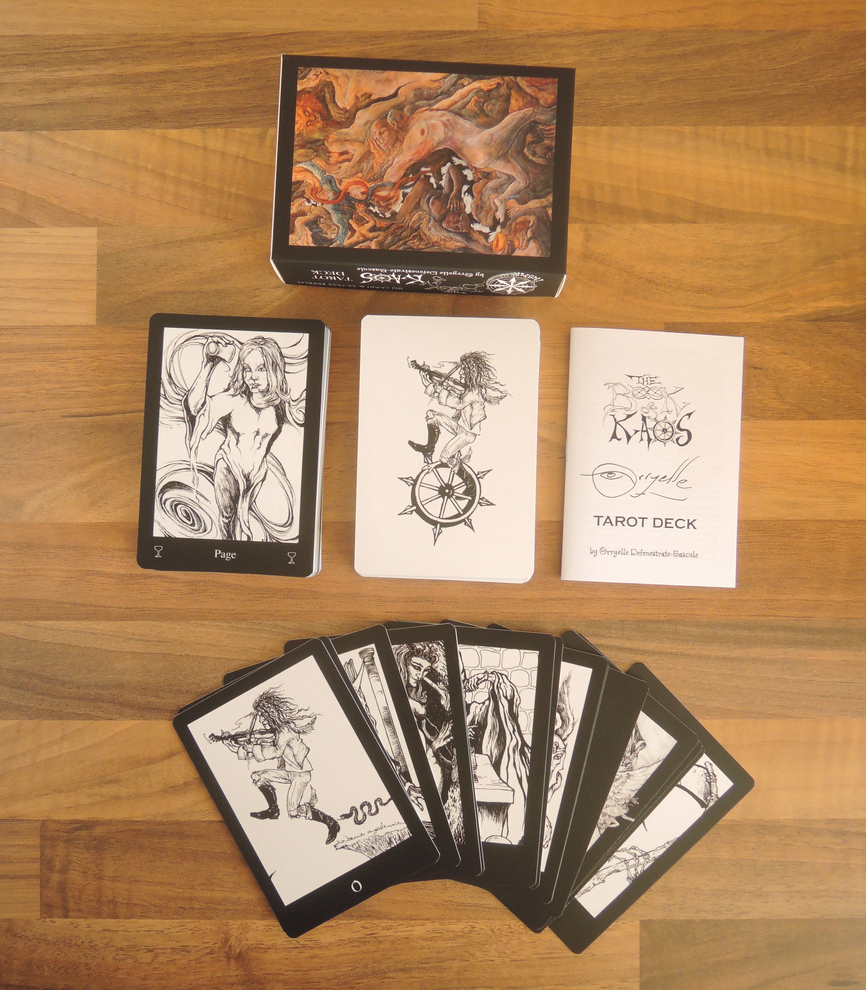 The Book of Kaos tarot deck by Orryelle Defenestrate-Bascule is back in print again, in a new and revised 2025 edition, after a long hiatus. First published in 2001, this full 78 card tarot deck features dramatic, black and white line drawings with Smith-Waite style illustrated pips, and it symbolism draws on a variety of influences including Austin Osman Spare, the Western mystery tradition and the artist's unique aesthetic.