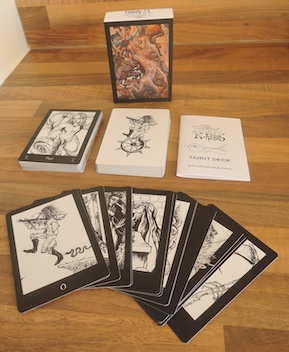 'Originally titled, 'The Bohemian Tarot' - (underwhich the original Major and Minor Arcana sets were published seperately as A5 limited-edition (100 copies) folios around 1991) I redrew about half of the major arcana a decade later to form the deck into 'The BOOK of KAOS', an inter-sect-ion of ChaOrder Magick and the aeonic double current of Horus and Maat. The introduction of these added layers of esoteric symbolism do not detract, however from the deck's original appeal of directly emotive, pagan and tribal imagery.