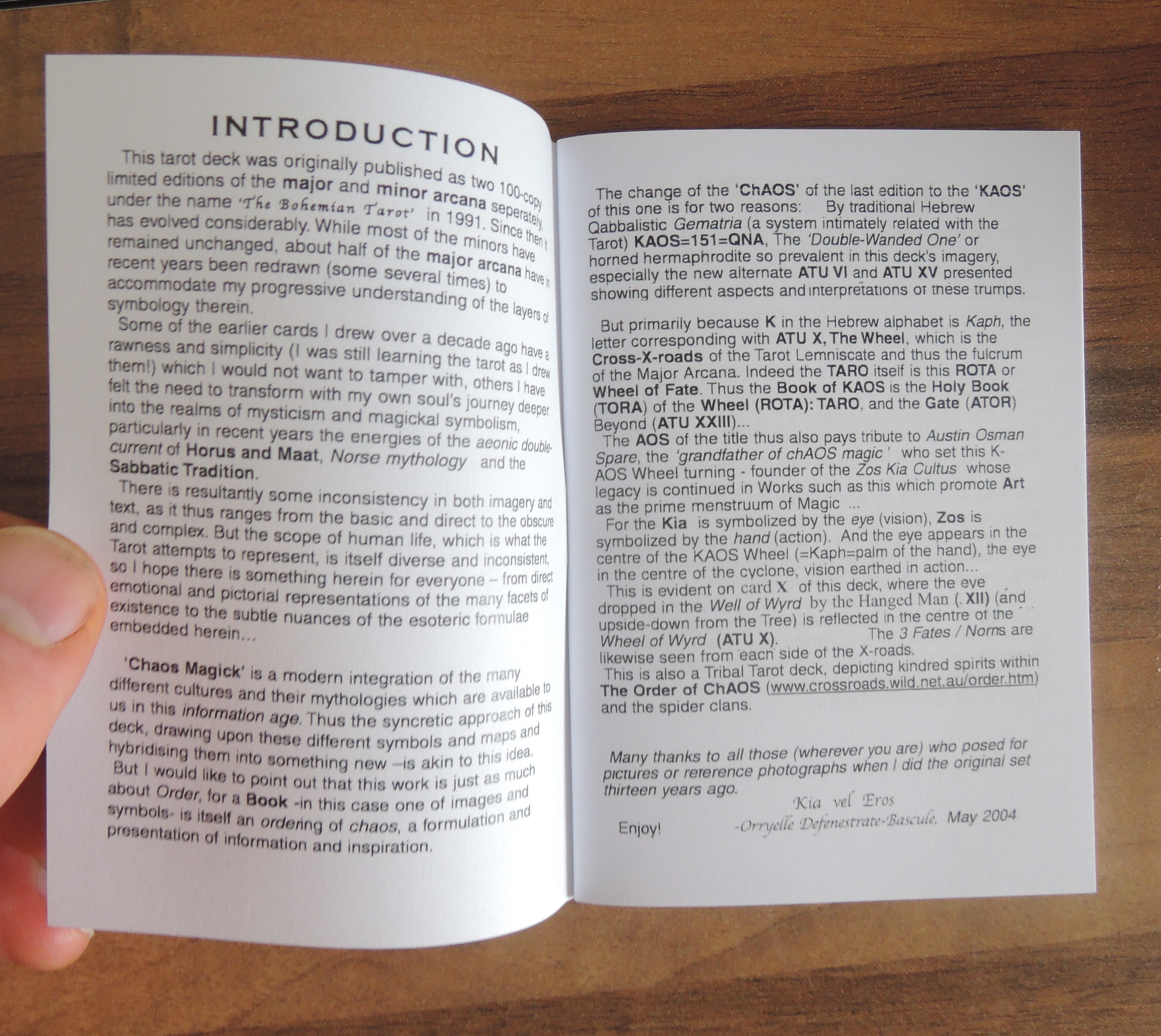 The change of the 'ChAOS' of that edition to the 'KAOS' of this one is for two reasons: By traditional Hebrew Qabbalistic Gematria (a system intimately related with the Tarot) KAOS = 151 = QNA, The 'Double-Wanded One' or horned hermaphrodite so prevalent in this deckÂs imagery, especially the new alternate ATU VI and ATU XV presented for the first time in this edition, showing different aspects and interpretations of these trumps. But primarily because K in the Hebrew alphabet is Kaph, the letter corresponding with ATU X, The Wheel, which is the Cross-X-roads of the Tarot Lemniscate and thus the fulcrum of the Major Arcana. Indeed the TARO itself is this ROTA or Wheel of Fate. Thus the Book of KAOS is the Holy Book (TORA) of the Wheel (ROTA): TARO, and the Gate (ATOR) Beyond (ATU XXIII)...